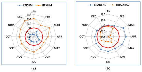 Figure 2 summarizes the monthly domain difference of the 2 m temperature for each parameter, namely tkhmin (Figure 2a), rad_fac (Figure 2b), uc1 (Figure 2c), v0snow (Figure 2d) and rlam_heat (Figure 2e). It should be noted that different scales are used; thus, the graph with the largest scale range denotes the most sensitive parameter. The red polygon refers to the zero sensitivity “axis”, where the test value of the parameter gives the same 2 m temperature as the one gained using the default parameter value. Blue and orange lines connect monthly 2 m temperature differences when the parameter takes its minimum, denoted with L in front of the parameter acronym (e.g., LTKHM for tkhmin) and maximum value with H, respectively (e.g, HV0SN for maximum v0snow). As shown in Figure 2a–c, 2 m, the temperature is, as expected, mainly affected by turbulence (represented by tkhmin), where the temperature difference within the parameter range (blue and orange lines) reaches 0.4 °C for December, January and March and by radiation (rad_fac and uc1 parameters) with up to 0.3 °C for April and May, parameterization schemes. On the contrary a low sensitivity of 2 m temperature on grid scale precipitation and surface parameterization scheme is evident, as changing v0snow (factor for vertical velocity for snow) and scalar resistance for the latent and sensible heat fluxes in the laminar surface layer (rlam_heat) gives a maximum temperature difference of 0.09 °C for August (Figure 2d) and only 0.07 °C, for April, respectively (Figure 2e).