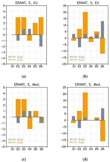 Figure 6 shows changes in the persistence of extreme tracks over D0, changes that are layered by origin source and severity class (“E” and “S”) for each target sub-domain of Di (i = 1,6). The comparison of δT and δD in Figure 6 highlights the main changes. In summer the main change occurred persistently, which increased considerably (regional Di factors δT/δD > 2) for all extremes, and almost overall in D0 (Figure 6a,b). An exception is when the northeastern D0 (D6), where “EU” and “Med” northern-tracks reaching D6 may be faster (Figure 6c,d), though the opposite is when the “2xMed” tracks showed a significant increased persistence in D6 and an increased intensity, switching from “S” to “E” (Figure 6e,f). The main increase in summer persistence was seen in SE (D3) where, although the more frequent events are “S” type, the persistence caused the events to have an influence for a longer period of time (regional D3 factor δT/δD = 2.6) and to be more severe in the area in P2 than in P1. Regarding “E” extremes, these became far more persistent in the north (D5). The meridional axis of areas with increased persistence (D5, D2, and D3) was usually associated with summer blocking circulation at SE Europe longitudes.