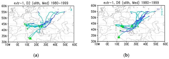 We compared the distribution of extreme storm tracks in P2 against P1 for winter and summer. Analysis of these tracks emphasized two main aspects: the first was related to changes in origins. For winter (Figure 7), we noted that tracks leading to extremes over D6 (and which were more frequent in P2) have farther West–Southwest origins in P2 than in P1 (Figure 7b,d). This is was a characteristic of the stronger extremes for DJF months (when a jet is well developed) along P0 (P1 + P2), as seen in Figure 7, and was in agreement with previous studies showing that extremely severe Mediterranean winter cyclones are characterized by a longer lifetime [63]. Opposite to this, tracks leading to winter extremes over the southern region of D2 (which became less frequent in P2) presented less shift in the origins and less zonality (kinetic energy) of mean tracks (Figure 7a,c). We note that Figure 7b,d also indicates that “E” extremes in D6 became more frequent earlier, switching from JFM months in P1 to late autumn (ND months) in P2 (which is also the period reported for having the heaviest rain for the Eastern and Western Mediterranean Sea [64], respectively; hence, a westward shift of origins would be coherent with more extreme tracks in autumn).