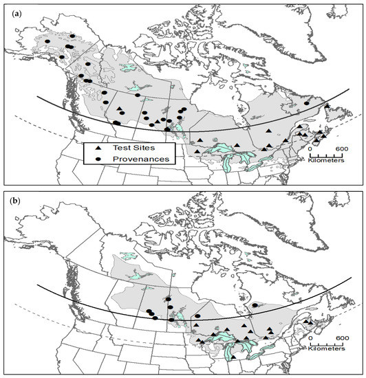Black spruce provenance data were obtained from measurements on a portion of the Canadian Forest Service’s (CFS) long-term black spruce provenance trial, which originally incorporated 202 seed sources across 34 test sites in Canada and the United States (see [22] for details). Measurements of height and diameter of all surviving trees at each test site were made in 2003, at 33 years of age from seed (see [16] for details). In total, 192 seed sources at 18 test sites in Canada and one test site in Minnesota were included in the measurement. Based on a cut-off of 52° N, 30 of these seed sources qualified as originating from the north (Table S1, Figure 2a). These northern seed sources were planted, in various combinations, at 17 different test sites—many of which were located south of 52° N (Figure 2a).