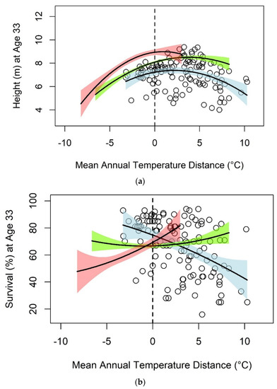 Relationship between mean annual temperature and (a) height and (b) survival of black spruce seed sources at 33 years of age. Separate regression lines and 95% confidence intervals are shown for southern (red), central (green), and northern (blue) seed sources. Data points (black circles) are shown only for northern seed sources. The vertical dashed line indicates local deployment of seed sources (i.e., a transfer distance of zero); points to the right of this line indicate seed transfers to warmer planting sites and vice versa.