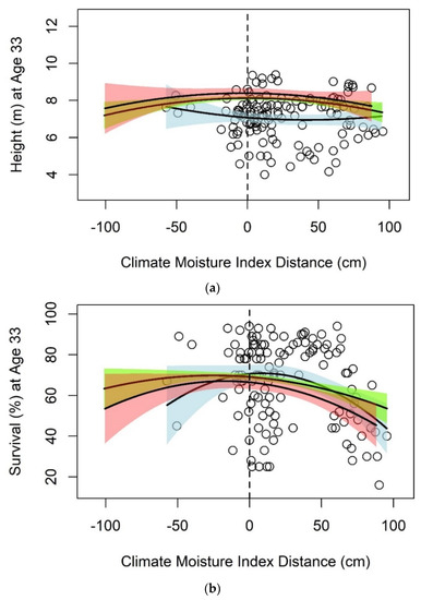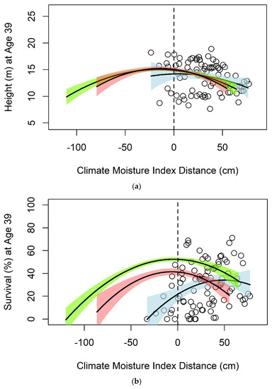 Relationship between climate moisture index transfer distance and (a) height and (b) survival of black spruce seed sources at 33 years of age. Separate regression lines and 95% confidence intervals are shown for southern (red), central (green), and northern (blue) seed sources. Data points (black circles) are shown only for northern seed sources. The vertical dashed line indicates local deployment of seed sources (i.e., a transfer distance of zero); points to the right of this line indicate seed transfers to wetter planting sites and vice versa.