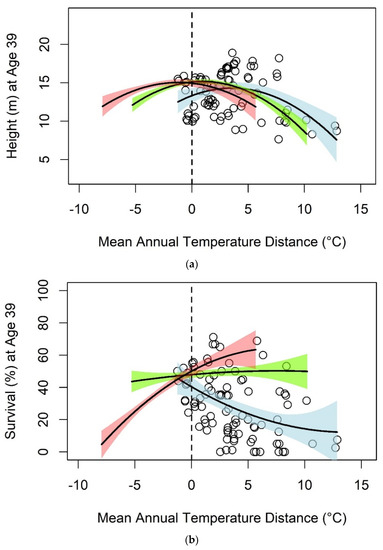Relationship between mean annual temperature transfer distance and (a) height and (b) survival of jack pine seed sources at 39 years of age. Separate regression lines and 95% confidence intervals are shown for southern (red), central (green), and northern (blue) seed sources. Data points (black circles) are shown only for northern seed sources. The vertical dashed line indicates local deployment of seed sources (i.e., a transfer distance of zero); points to the right of this line indicate seed transfers to warmer planting sites and vice versa.