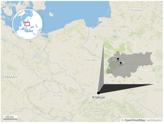 The location of PM10 sampling sites in Krakow. AK—traffic-dominated site, ZR—urban-background site (Maps OpenStreetMap) [].