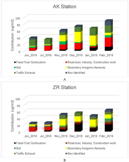 Figure 6 shows the results of PMF analysis of PM10 fraction for AK and ZR stations for particular months. Five factors were obtained from PMF analysis for each station. The identified sources, together with the main tracers, are presented in Table 3. The main contributions to the sources of the PM10 mass are presented in Figure 6 and Table 4. The first factor was identified by the presence of Cl, NO3−, Na+, OC and EC and was attributed to fossil fuel combustion. Cl has a high enrichment factor (1130) suggesting its anthropogenic origin. Most probably, chlorine comes from the combustion of coal and to a lesser extent from pavements and road de-icing during wintertime. The contribution of EC in this source can explain primary PM in Krakow coming from the combustion of different solid fuels. Secondary inorganic and organic aerosols are also present. The second factor was identified by the presence of NO3−, SO42−, NH4+ and was attributed to secondary inorganic aerosols. The third factor characterized by the presence of EC, OC, SO42−, NO3−, Ti, Cu, Fe, Co, NH4+ can be assigned to exhaust emission traffic. Cu has been found to be associated with gasoline. Fe is fuel additive and can be emitted from diesel engines. Vehicles also emit carbonaceous compounds such as OC and EC. Gasoline emits more OC and diesel more EC. Motor vehicles are significant contributors to elevated post catalyst emission of NH3, which transforms in the atmosphere into secondary inorganic aerosols. Small amounts of Sulphur components exist in gasoline. Different forms of Sulphur can be formed in three-way catalytic converters []. Cu and Co have mixed origin; enrichment factors are around 100. So, the presence of these elements in the exhaust emission factor suggests their anthropogenic origin. Fe and Ti have enrichment factors below 10, meaning they originate naturally. The source of these elements can be also anthropogenic. The next factor identified by the presence of Ni, PO43−, Na+ was assigned to soil. Ni has EFs equal to ten, suggesting a natural origin. The last factor was identified through the presence of Ca, Ti, Co, Cr, Fe, Mn, Zn, Cu and was assigned to road dust (non-exhaust traffic emission), industry and construction work. The industrial source is identified by the following elements: Fe, Mn, Zn, Cr and Cu. The enrichment factor for Zn and Cu was around 100, demonstrating anthropogenic origin. Co, Fe, Zn and Cu are traffic related elements. Ca can be attributed to construction works []. The dominant contribution in winter had two main sources: fossil fuel combustion and secondary inorganic aerosols. They were 65% (fossil fuel 36% (20 µg/m3) and secondary inorganic aerosols 29% (16 µg/m3)) and 38% (fossil fuel 10% (7 µg/m3) and secondary inorganic aerosols 28% (21 µg/m3)) at ZR and AK stations, respectively. In winter, 24% (18 µg/m3) and 16% (9 µg/m3) of PM10 came from exhaust traffic emissions at AK and ZR stations, respectively. In winter, the contributions of non-emission traffic, industry and construction work were 24% (18 µg/m3) and 8% (5 µg/m3) at AK and ZR stations, respectively. In summer, the contribution of non-emission traffic, industry and construction work was 48% (13 µg/m3) and inorganic secondary aerosols 16% (4 µg/m3) at the ZR station. As well as these sources, contributions at the AK station were 32% (11 µg/m3) and 5% (2 µg/m3) in the summer. In summer, the contribution of exhaust traffic emissions was 48% (17 µg/m3) and 4% (1 µg/m3) at AK and ZR stations, respectively. Weber et al. [] performed PMF analysis for 15 sites in France in the years 2012–2016. Wood burning for heating and traffic had main contributions to PM10 sources. The average contribution of wood burning to PM10 mass was 17%. SIA aerosols contributed, on average, 32% to PM10 mass. The values are very close to our results. Primary traffic contributed 15% to PM10 mass in France, while our study shows road dust, industry and construction works in one factor. This factor had a higher contribution to PM10 mass in summer than in winter.