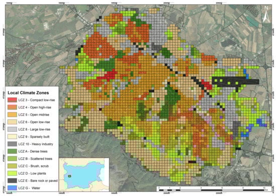 Collecting air temperature data with an appropriate spatial resolution for an entire city like Sofia is a complex task that requires expensive equipment and labor-intensive organization. A possible approach is to use remote sensing to provide a snapshot of the LST in time as a proxy for air temperature. This publication presents some of the results of a more extensive study using GIS-based spatial analysis methods, traditional satellite data sources, and high spatial resolution data from unmanned aerial vehicle systems (UAVs) []. The paper is organized as follows. After reviewing the literature on the topic (this Section), we present the approach used in the development of the map of LCZs in Sofia (Section 2.2) and UAV-based thermal surveys performed using a stratified sampling scheme (Section 2.3). In Section 3.1, we present the statistical characteristics of LST by LCZs, in Section 3.2 we perform spatial interpretation and analysis of the results obtained from the thermal imaging of the surface, and in Section 3.3 we demonstrate the map of the intensity of SUHI in Sofia. In Section 4, we discuss the results of the research, and in Section 5 we draw some conclusions about future research.