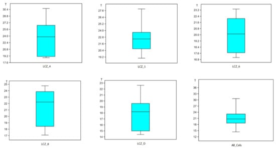 For each LCZ, the statistics of the LSTs measured in them were processed, with the exception of LCZ 3 and LCZ G, which are represented by only one sampling cell and contain only one temperature value. Of all 74 cells, 58 cells covered 77.3% of the total area of all cells examined. These are LCZ 4 (7 cells), LCZ 5 (15 cells), LCZ 6 (12 cells), LCZ 8 (14 cells), and LCZ D (10 cells). Table 2 presents the statistical characteristics of the LST of the studied cells.
