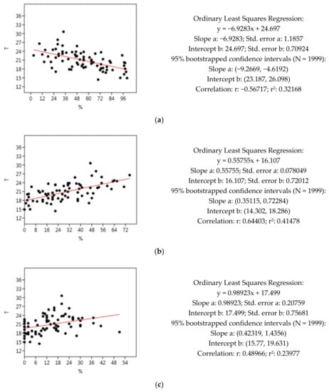 The results from the in-situ UAV-based thermal surveys were used to construct linear regression dependencies through the least-squares method between the areas of the main land-use types (as an independent quantity) and the average measured temperatures by land-use types (as a dependent value). The general conclusions confirm the hypothesis that the greater the proportion of green space, the lower are the measured temperature values, and vice versa—the higher the proportion of built-up and impervious areas, the higher are the surface temperatures (Figure 5).