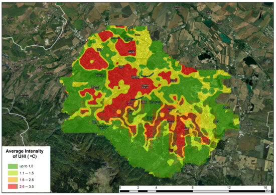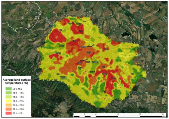 The range and spatial configuration of SUHI show significant variability over relatively short distances due to the complex combination of anthropogenic and natural elements forming the urban landscape. Therefore, the SUHI looks more like an “archipelago” than a clearly defined single thermal island. However, the warmest places generally coincide with the residential areas, which also affects the climatic comfort of the people. Therefore, future micro-scale studies should focus mainly on these urban areas.