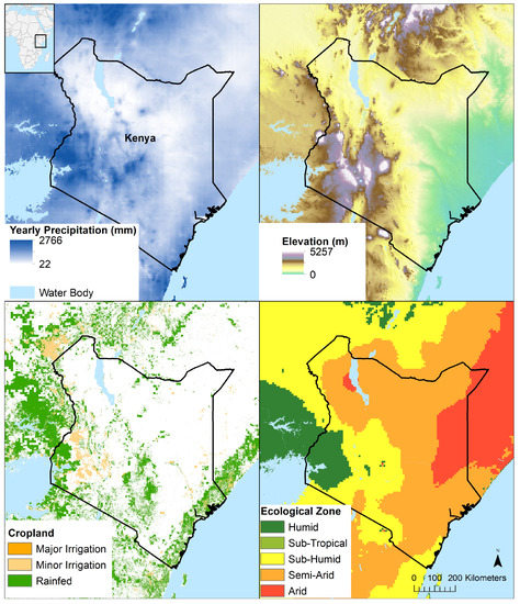 Yearly precipitation in Kenya from CHIRPS (top left) [35], elevation (top right) [40], cropland from Global Food-Support Analysis Data (bottom left) [41], and ecological zone (bottom right) [42].
