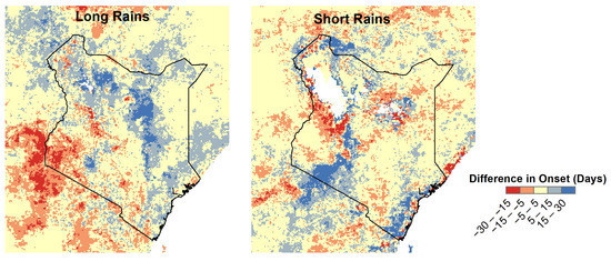 The absolute difference in onset dates in Figure 3 show the largest differences in predicted long rains’ onset in the southwest and northeast. The short rains had the largest differences in the predicted onset date in the highlands and along the coast.
