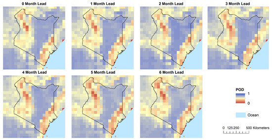 Figure 4 and Figure 5 show the spatial patterns of POD over both rainy seasons for dry and wet anomaly events. The spatial distribution of skill did not change much over the different lead times. For the detection of dry events, CFSv2 performed worse in the western half of Kenya and along the coast. Throughout central Kenya, the POD was near perfect. The spatial patterns for the detection of wet events were not as distinct, but they also appeared to perform slightly worse along the coast. POD was best for northeast Kenya, being between 0.25 and 0.5 in the western half of Kenya for wet events. The spatial patterns of FAR and HSS were similar to those of POD. HSS indicated that for wet anomaly events, CFSv2 is more skillful than a random forecast for the whole country, except along the coast. For dry anomaly events, it is more skillful than a random forecast, except along the coast and in a small area of the northwest.