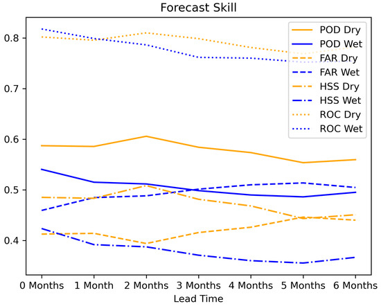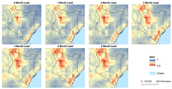 The ROC displayed similar patterns of skill as the other skill scores for dry events (Figure 6), with only a small area in the northwest having lower skill than a random forecast. For wet anomaly events (Figure 7), the pattern of ROC was similar to that of the dry events, but the region of lower skill in the northwest became larger with longer lead times.