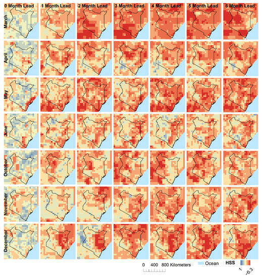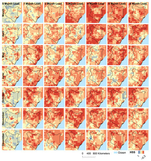 Though there was not much difference in skill between the different lead times when looking at the rainy seasons as a whole, it is obvious that the 0 month lead time performed much better when looking at individual months. The forecasts also performed worse overall when looking at individual months, with HSS being below 0 in many areas, indicating that the forecast is worse than the reference random forecast at those points. Spatial patterns are also different across each month, as shown in Figure 9 and Figure 10. The forecasts for individual months of the rainy seasons performed better than those during the dry seasons.