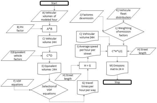 Depending on the availability of information and the level of detail required, the model is selected, and the EI is carried out following the approach: top-down (aggregated activity information) or bottom-up (specific activity information). The selection of the approach does not determine its correct implementation [3,13], and, in both cases, the inherent complexities of vehicular behavior in urban areas are a source of significant uncertainties in EI. However, a top-down approach where vehicle activity data are aggregated and all-day traffic conditions are not represented at the link level (flows and speeds) could affect the resulting emissions [5]. On the other hand, the bottom-up approach could improve the representation of the calculated vehicular emissions, since detailed information is obtained (through transport models) about the spatial distribution of types of roads and activity information of the vehicles, such as the average speed along road corridors and its temporal distribution [5,14,15].