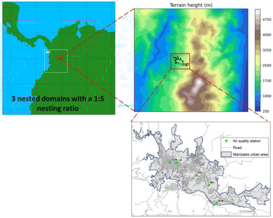 The Weather Research and Forecasting with Chemistry (WRF-Chem) model version 3.7.1 [36] was used to perform air quality simulations with the three different EIs as input information. Figure 2 shows the domain configuration of the model considering 3-nested domains (1:5 nesting ratio) with a downscaling process from 25-km resolution (parent domain) to 1-km resolution in the domain of interest, which covers the urban area of Manizales and surrounding areas. Details of model configuration are presented in Table S3, and major details about the reasons for the chosen configuration are described in the study by [18].