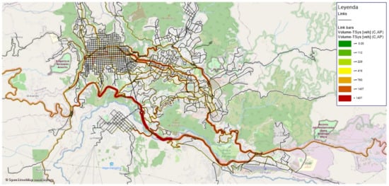Around 45,948 vehicles were assigned to the network to represent traffic conditions of the morning rush hour in Manizales (6:45—7:45 am). The traffic assignment model converged to a stable solution, thus reaching equilibrium conditions. Figure 3 shows the assigned flows and the goodness of fit in the model for private vehicles after following a state-of-the-practice transport modeling calibration process. Similar results for taxis, motorcycles, and trucks were obtained.