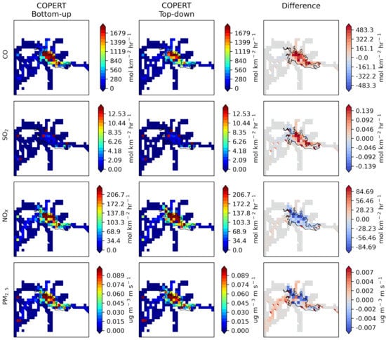 Spatial distribution of emissions of the COPERT/bottom-up and COPERT/top-down EIs, and difference map (bottom-up minus top-down).