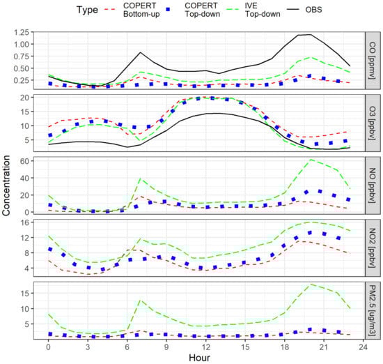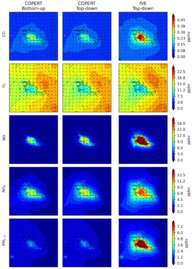 Despite the similarities in the spatial distributions, the levels of concentrations presented significant differences, especially by comparing the IVE/top-down and the COPERT/top-down EI. For instance, CO concentrations with the IVE inventory reached a maximum value of 0.58 ppmv, while CO concentrations did not exceed the 0.28 ppm with the COPERT EI. A similar scenario was observed for NO, NO2, and PM2.5, all presenting higher values with the IVE EI than with the COPERT EI. The differences in the predicted concentrations were associated with the lower estimated emissions with COPERT EI than with IVE EI, as discussed in Section 3.2.2.