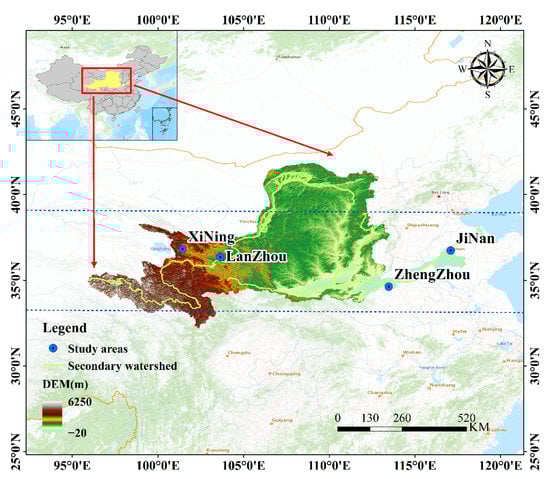 The Yellow River Basin is an important ecological barrier in northern China. It is also an important agricultural production base and energy base. This study selected four typical cities in the Yellow River Basin as study areas, as shown in Figure 1 and Figure 2. Xining is the city with the highest altitude, with an average altitude of 3137 m. Lanzhou is one of the important central cities in the western region, with an average altitude of 1520 m. Xining and Lanzhou have a typical temperate semi-arid climate. The average altitudes of Zhengzhou and Jinan are 108 m and 57.8 m, respectively. Moreover, Zhengzhou is representative of a fast-developing industrial city, while Jinan is one of the central cities in eastern China, in the middle and lower reaches of the Yellow River.