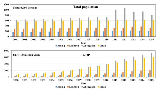 Statistical histogram of total population and Gross Domestic Product (GDP) in Xining, Lanzhou, Zhengzhou and Jinan from 2000 to 2015.