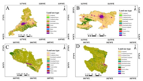 Spatial distribution of land use types in Jinan, Zhengzhou, Lanzhou and Xining in 2015. Connectors indicate the transfer of land types from 2000 to 2015. For example, Cropland-urban indicates that cropland areas have turned into urban areas. ((A) Jinan City, (B): Zhengzhou City, (C): Lanzhou City, (D): Xining City).