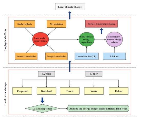 Here, is used to express the forcing of energy uptake caused by biogeochemical factors. The negative sign indicates that decreases with the increase of albedo, and LE represents the forcing of consuming on energy consumption. Therefore, in this study represents the final result of surface energy budget between energy intake and expenditure caused by LUCC. In the forcing balance, a larger reduces the energy of sensible heat flux and soil heat flux. Thus, when less energy is used to heat the atmosphere and surface temperature, it corresponds to a cooling feedback or a weak warming feedback. Conversely, lower values of equate to a stronger warming feedback [,]. The basic research framework is shown in Figure 4.