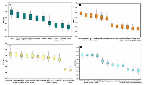 Statistical characteristic values of land surface temperature based on different land types from 2000 to 2015 ((A) Jinan City, (B) Zhengzhou City, (C) Lanzhou City, (D) Xining City. LST here is in kelvin).