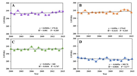 Trend of land surface temperature from 2000 to 2015 ((A) Jinan City, (B) Zhengzhou City, (C) Lanzhou City, (D) Xining City).