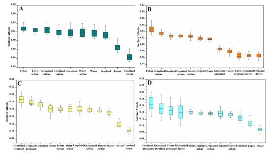 Statistical characteristic values of surface albedo based on different land types from 2000 to 2015 ((A) Jinan City, (B) Zhengzhou City, (C) Lanzhou City, (D) Xining City).
