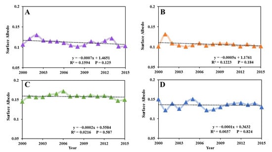 Trend of surface albedo from 2000 to 2015 ((A) Jinan City, (B) Zhengzhou City, (C) Lanzhou City, (D) Xining City).