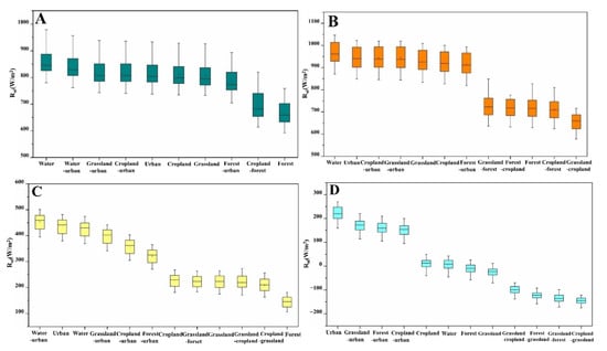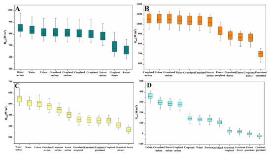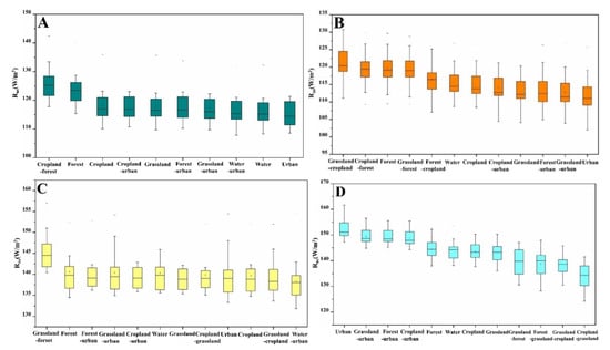 Statistical characteristic values of net radiation based on different land types from 2000 to 2015 ((A) Jinan City, (B) Zhengzhou City, (C) Lanzhou City, (D) Xining City).