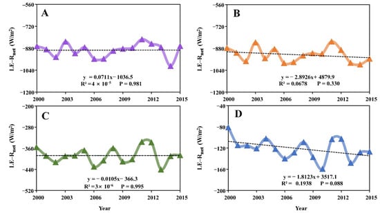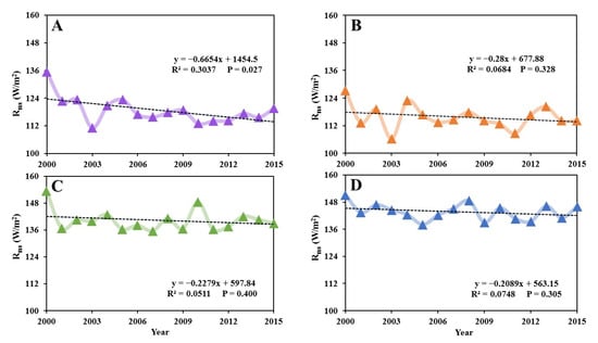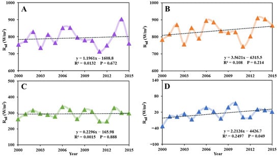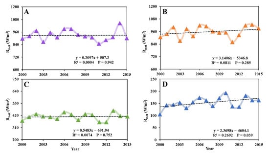 Trend of net radiation from 2000 to 2015 ((A) Jinan City, (B) Zhengzhou City, (C) Lanzhou City, (D) Xining City).
