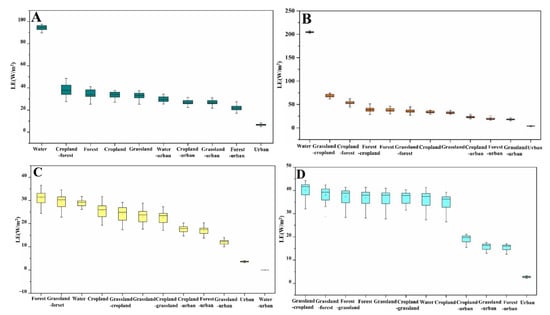 Statistical characteristic values of longwave radiation based on different land types from 2000 to 2015 ((A) Jinan City, (B) Zhengzhou City, (C) Lanzhou City, (D) Xining City).