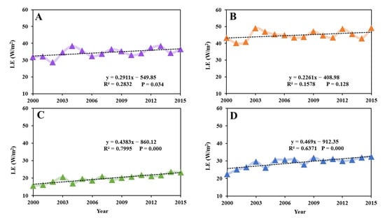 Trend of LE from 2000 to 2015 ((A) Jinan City, (B) Zhengzhou City, (C) Lanzhou City, (D) Xining City).