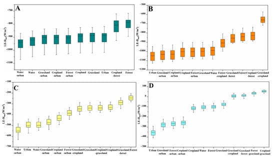 Statistical characteristic values of LE based on different land types from 2000 to 2015 ((A): Jinan City, (B): Zhengzhou City, (C): Lanzhou City, (D): Xining City).