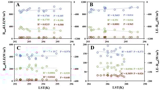 Correlation between LST and , LE, and under five land types (blue dots and lines represent scatter plots of LST and , red dots and lines represent scatter plots of LST and LE, and green dots and lines represent scatter plots of LST and . ((A) Jinan City, (B) Zhengzhou City, (C) Lanzhou City, (D) Xining City).