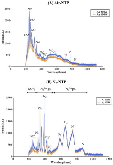 Optical analysis of NTP and djulis seeds: (A) the OES (optical emission spectroscopy) spectrum after air atmospheric plasma (air-NTP) and (B) the OES spectrum after nitrogen gas atmospheric plasma (N2-NTP) treatment.