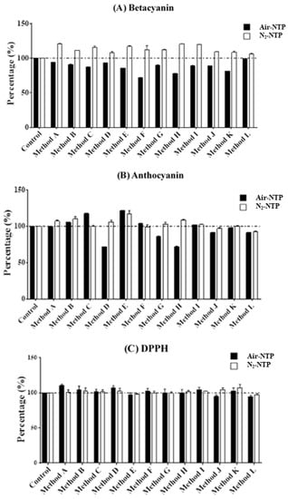The levels of betacyanin, anthocyanin, and DPPH in NTP-treated djulis seed varied as compared with those in the untreated control (Figure 3). The betacyanin concentrations in N2-NTP-treated seed ranged from 1.06- to 1.21-fold higher than those in the untreated seed (p < 0.01) (Figure 3A). Inversely, the betacyanins in the air-NTP-treated djulis seed were significantly lower than those in the untreated control (p < 0.01). Figure 3B shows the significantly elevated levels of anthocyanin in the NTP-treated seed as compared to the untreated sample for methods B, C, E, F, and I after the air-NTP treatment (increased 1.02–1.21 fold, p < 0.001) as well as methods A, B, D, E, G, H, and I after N2-NTP treatment (increased 1.03–1.17 fold, p < 0.001). In terms of the antioxidant activity, such as DPPH, there were significantly higher magnitudes in the air-NTP-treated seed with methods A, D, and E (increased 1.04–1.10 fold, p < 0.001) as well as in the N2-NTP-treated seed with methods H to K (increased 1.02–1.07 fold, p < 0.001) as compared with the untreated seed.