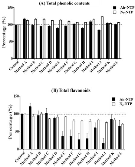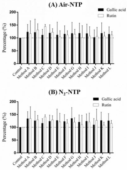 In the present study, bioactive compounds, with the exception of TFs, were enhanced by the N2-NTP treatment, and these chemicals were inhibited by the air-NTP treatment under most testing conditions. According to the different patterns in the OES spectra between the air-NTP and N2-NTP treatment groups shown in Figure 1, these results were inferred to be due to the different reactive species generated by treatment of air-NTP and N2-NTP. Nitrogen oxide species (NO-γ) from 200 to 300 nm possibly were generated by N2-NTP plasma jet in the OES spectra, mainly due to the collision of the RNS in N2-NTP with the surrounding air [,]. Figure 1 shows that differences in the intensities of NO, N2, and N2+ on the OES spectra were also found between the air-NTP and N2-NTP treatment groups. The different species of reactive substances in plasma ionizing gas were induced by plasma discharge with the different working gases. Nitrogen-based reactive species, such as nitrogen dioxide (•NO2) and nitric oxide (•NO), which are RNS, and nitrous oxide (N2O), nitrogen trioxide (NO3), peroxynitrite (ONOO−), and dinitrogen tetroxide (N2O4), which are reactive gases, were generated by air-NTP or N2-NTP treatment; while oxygen-based reactive species, including ROS generated by air-NTP or O2-NTP included hydrogen peroxide (H2O2), ozone (O3), hydroxyl, singlet oxygen (1O2), hydroxyl radical (•OH), and superoxide (O2−•) [,].