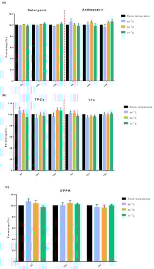 Figure 6 showed the changes of bioactive compounds on the djulis seed before and after thermal treatment. Compared with the non-thermal control (room temperature), the fold increases of bioactive compounds including betacyanin, anthocyanin, TFCs, TFs, and DPPH from the djulis seed extract in the thermal-treated samples were not significantly different in Figure 6A–C.