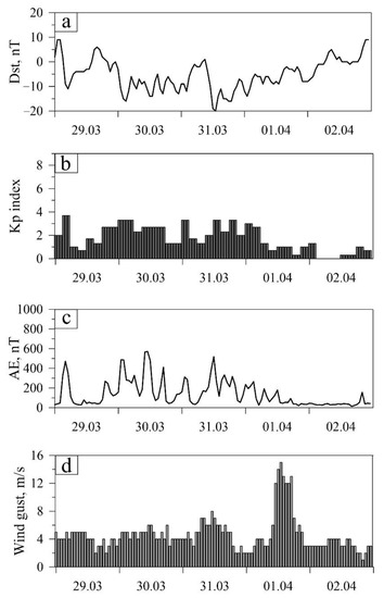 The geomagnetic conditions from 29 March to 2 April 2016 are presented in Figure 1 following the SPDF-OMNIWeb service (https://omniweb.gsfc.nasa.gov, accessed on 15 September 2021). It can be seen that they were quiet on the eve and during the meteorological storm in Kaliningrad on 1 April 2016. Thus, the Dst index varied from −20 to 10 nT (no more than 20 nT per day), the Kp index did not exceed 3.3, and the AE index did not exceed 500 nT. At the same time, on March 31, there was an increase in wind gusts up to 8 m/s, and on 1 April 2016, from 12:00 to 19:00 UTC, wind gusts reached 14 m/s, which corresponds to a meteorological storm. On calm days, 29 and 30 March, and 2 April 2016, a weak and moderate wind with a speed of 2–4 m/s was observed.