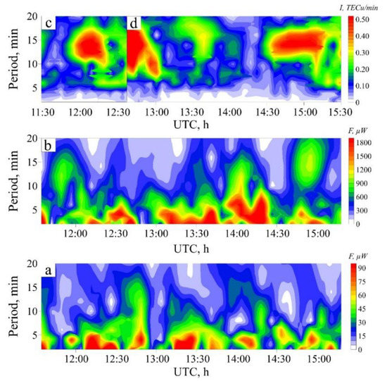 Analysis of the data in Figure 3 suggests that the response of the ionosphere to an increase in the amplitudes of tropospheric disturbances with a period of 3–5 min at 11:35–12:40, 13:00–13:40, and after 14:00 UTC are TEC disturbances with periods 10–17 min at 12:05–12:40, 13:00–13:45 and after 14:40 UTC, respectively. Note that the characteristic response time of the ionosphere to tropospheric disturbances is 30–40 min.