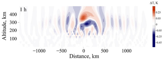 The spatial structure of temperature perturbations in the atmosphere 1 h after switching on the source of perturbations is shown in Figure 6. As can be seen from the figure, immediately above the disturbance region, cooling regions below 300 km and heating regions above 400 km are formed. The spatial proportions of these regions are somewhat larger than the size of the disturbance source in the lower atmosphere.