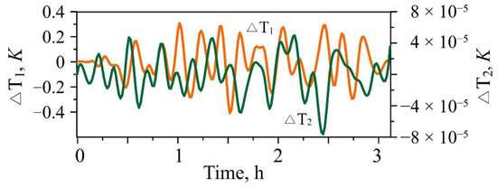 Temperature variations in the region of the tropospheric source (green line) and at an altitude of 300 km (orange line). The initial moment corresponds to the start time of calculations.