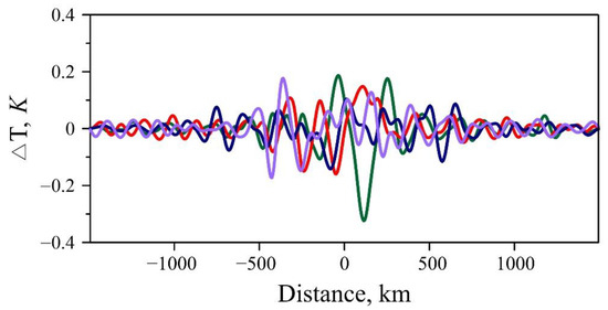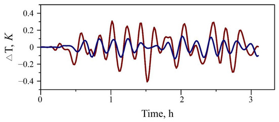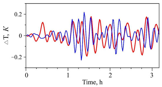 Figure 7 shows temperature perturbations at an altitude of 300 km above the source of perturbations in the lower atmosphere and a point displaced by 500 km. As can be seen from the figure, the disturbances above the source region in the thermosphere repeat their non-stationary character (see Figure 3a,b), while at the shifted point, the process is characterized by quasi-harmonic damped oscillations with a period of ~20 min.
