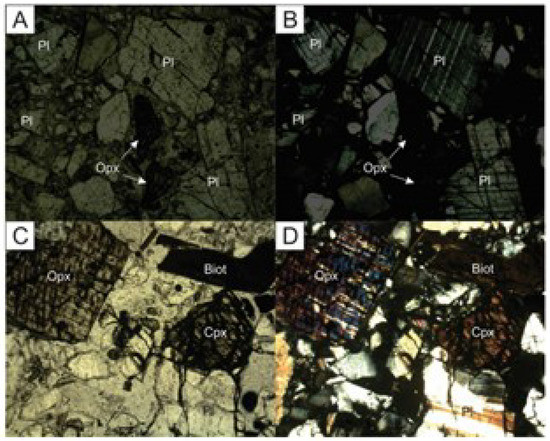 (A) PPL view showing Plagioclase feldspar (Pl) and Orthopyroxene (Opx); (B) XPL view showing Plagioclase feldspar (Pl) and Orthopyroxene (Opx); (C) PPL view showing Orthopyroxene (Opx), Biotite (Biot), Clinopyroxene (Cpx), and Plagioclase feldspar (Pl) (D) XPL view showing Orthopyroxene (Opx), Biotite (Biot), and Cl.