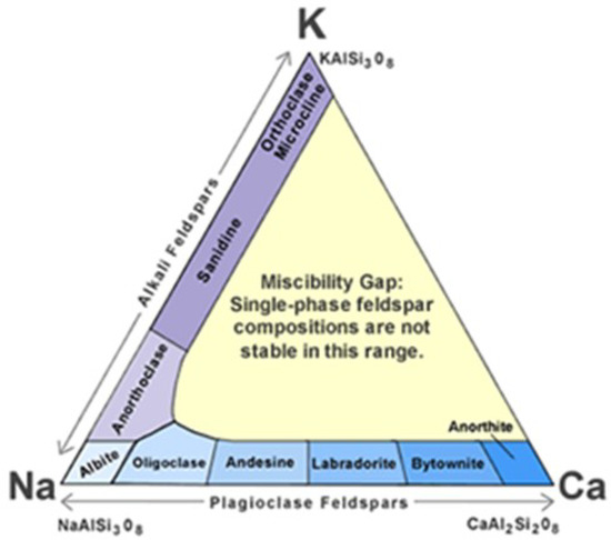 - Available online: https://th.bing.com/th/id/R.18ffed079762d777124822fb6d1d3054?rik=OdrtAaTiRm4rrg&riu=http%3a%2f%2fgeology.com%2fminerals%2fphotos%2ffeldspar-classification.gif&ehk=uBmAq3X8o9qT89M4456DlUiYuvLXDf1y3X%2bFXEDex48%3d&risl=&pid=ImgRaw&r=0 (accessed on 20 July 2021).