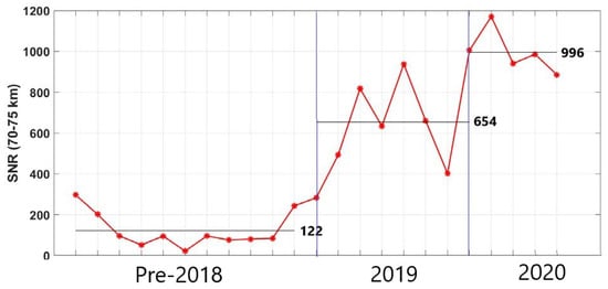 Monge lidar SNR from 70 to 75 km for selected nights. The improvements in 2019 correspond to the replacement of the PMTs and Licel; the improvements in 2020 correspond to the replacement of all nine lidar mirrors.