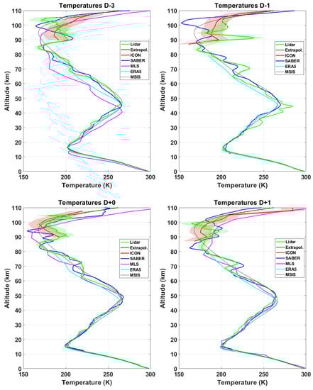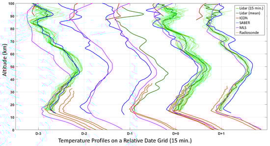 The Monge lidar is primarily used for military applications during ballistic vehicle launches. We are able to use the lidar data for scientific purposes after a campaign, with the sensitive dates and locations of the measurements removed. The convention that we are adopting to reference dates in our study is to count the days preceding or succeeding the launch date of the rocket (D+0). Despite not presenting rocket data in this paper, the lidar data we receive are given to us in the context of a rocket campaign. In Figure 3, we present a graphical summary of the five nights of data available to us: MLS (magenta), SABER (blue), ICON (red), 15 min lidar profiles (green), nightly average lidar profiles (dark green), and locally launched radiosondes (orange). The abscissa is a vector of times, in 15 min increments, with respect to the launch time of the rocket (D+0). The temperature profiles for each instrument are plotted on this common grid.